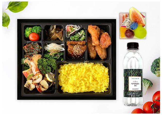 메뉴구성: 모듬전&왕새우구이&전복구이, 닭윙&닭봉, 갓김치, 방울토마토&브로콜리, 수제장아찌, 명란젓&고추볶음, 2색나물, 너비아니구이기본구성: 도시락, 국, 수저세트, 고급생수, 과일컵